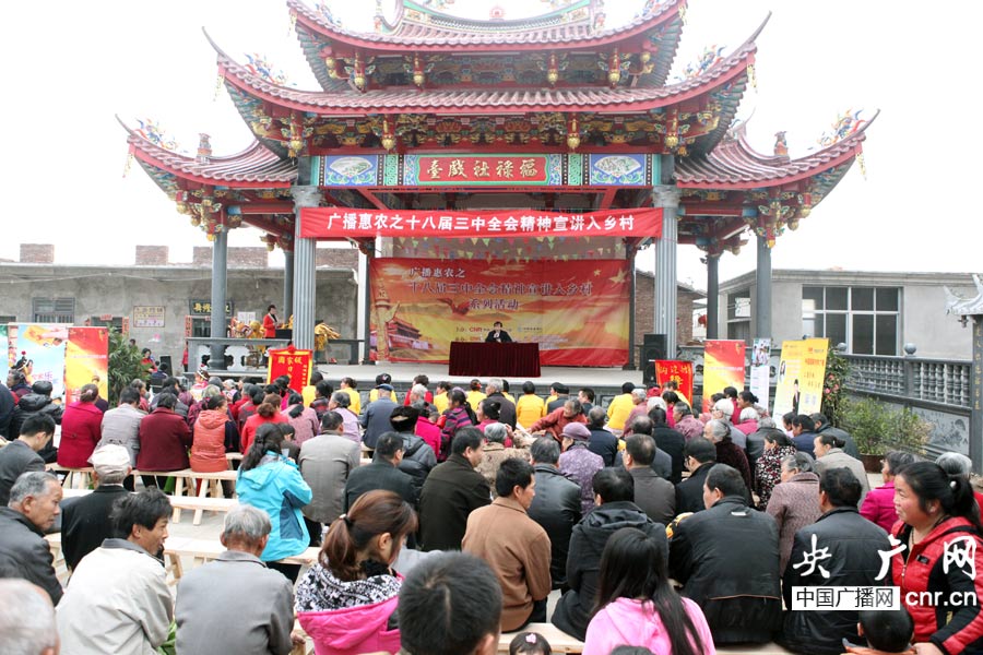 央廣網(wǎng)莆田2月25日消息(記者陳江南 何鵬)馬年正月,由中央人民廣播電臺與中國農(nóng)業(yè)銀行共同主辦的《廣播惠農(nóng)之十八屆三中全會精神宣講入鄉(xiāng)村》活動(dòng)繼續(xù)馬不停蹄,于2月25日至27日深入福建省莆田、泉州、漳州,相繼在荔城、惠安、漳浦三縣區(qū)的農(nóng)村舉辦宣講活動(dòng)。宣講活動(dòng)中,中國農(nóng)業(yè)科學(xué)院農(nóng)村經(jīng)濟(jì)與發(fā)展研究所所長秦富結(jié)合農(nóng)民身邊的具體案例,結(jié)合中央經(jīng)濟(jì)工作會議、城鎮(zhèn)化工作會議和中央農(nóng)村工作會議精神,結(jié)合中央一號文件,詳細(xì)解釋了十八屆三中全會精神中關(guān)于土地流轉(zhuǎn)、宅基地轉(zhuǎn)讓、土地抵押貸款等與農(nóng)民生產(chǎn)生活利益相關(guān)的三農(nóng)政策,并對農(nóng)民和鄉(xiāng)鎮(zhèn)干部提出的問題和存在的困惑進(jìn)行了生動(dòng)、詳細(xì)的解答;顒(dòng)中,演藝明星們還為現(xiàn)場的農(nóng)民帶來了快板《十八屆三中全會開紅花》以及歌曲表演。