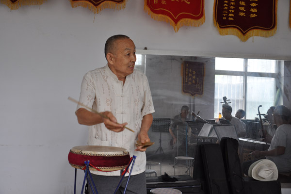 別人說我都不在乎,沒有退縮,接著唱。用紙箱當(dāng)鼓,弄了兩塊鐵皮當(dāng)板,紙箱幾天就壞了,我用膠帶胡上幾層,就好多了。后來,買了真的鼓和板,開始選學(xué)大鼓時,認(rèn)為簡單,真學(xué)起來,可不是那么回事。就鼓板的打法我整整練了三個月,才打出節(jié)奏。聽說樓底村有個農(nóng)民工俱樂部,我就打聽著找去了,到那一看驚呆了,有幾十個人,十來種樂器,領(lǐng)頭的是李俊岐,樣樣在行,我決心在這里學(xué)習(xí)。李俊岐老師說“不能光在沒人的地方唱,要見世面,老有所養(yǎng),老有所樂,F(xiàn)在生活這樣好,應(yīng)該感謝黨,感謝社會,多參與群體活動”。給了我登臺演唱會的機(jī)會,從此,就開始在有人的地方唱了。