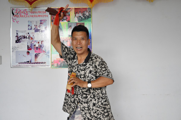 趙縣文化館的張秀藝?yán)蠋,就是我的啟蒙老師,在張老師的耐心輔導(dǎo)下,我終于學(xué)會了打板并演唱一下小段,當(dāng)我能打出和收音機(jī)一樣的開場板兒時,我興奮不已,高興地都跳了起來。從此,也就經(jīng)常參加縣里的各類演出活動。2006年,來到石家莊打工,一直到參加樓底農(nóng)民工俱樂部,還發(fā)生了一件小插曲,記得有一次演出,不但詞不熟,而且,開場板打的稀里嘩啦的,節(jié)奏很亂,唱起來更要命,可以說基本上沒在一個點上,自己聽著都別扭,觀眾聽在更難受。從此,以后就做了心病,一上臺就開始緊張,一緊張,完啦,你想,全身的細(xì)胞肌肉都不聽使喚啦,那個亂啊。