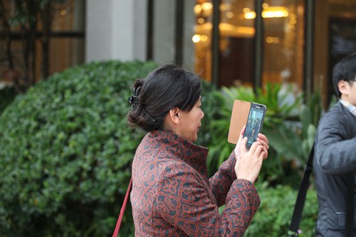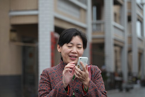 中國鄉(xiāng)村之聲記者傅雪琴在湖南郴州農村采訪時使用手機進行微博直播報道