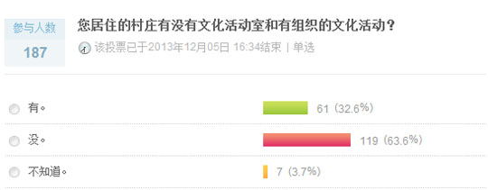 根據(jù)中國鄉(xiāng)村之聲在新浪微博發(fā)起的投票調(diào)查顯示,超過六成網(wǎng)友表示,自己所居住的村子沒有文化活動(dòng)室和有組織的文化活動(dòng)