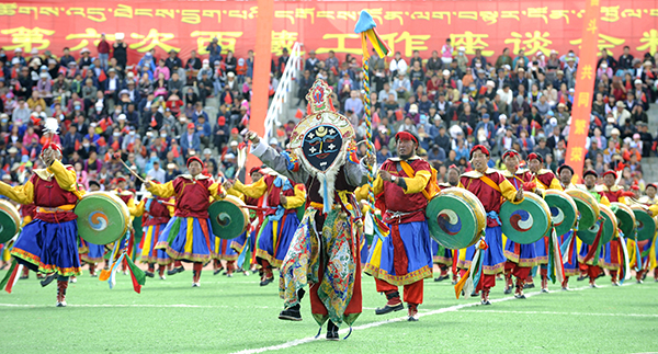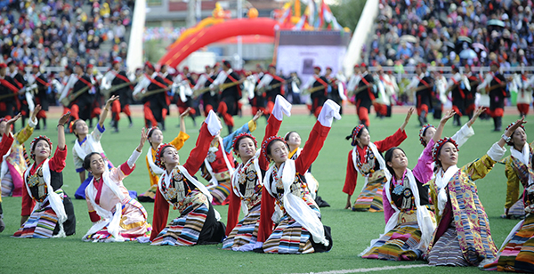 8月25日,演員在第十四屆西藏珠峰文化旅游節(jié)開幕式上表演斯馬卓舞。
