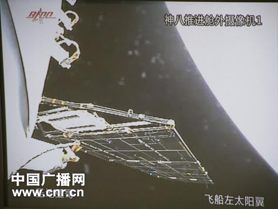 11月17日,神舟八號推進艙外攝像機傳回實時圖像,展示飛船左太陽翼工作圖景。根據(jù)“天宮一號/神舟八號交會對接任務(wù)”總指揮部會議決定,神舟八號飛船返回艙將于今晚七點左右返回地面。 (中廣網(wǎng)記者劉夢 攝)