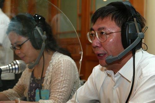 慶祝中國共產(chǎn)黨成立85周年暨總結(jié)保持共產(chǎn)黨員先進性教育活動大會,30日上午9時在中南海懷仁堂禮堂隆重舉行。胡錦濤、吳邦國、溫家寶、賈慶林、曾慶紅、黃菊、吳官正、李長春、羅干出席。中央人民廣播電臺中國之聲、中華之聲、華夏之聲對活動大會進行了現(xiàn)場直播。圖為中央臺播音員陸洋在直播現(xiàn)場。 中廣網(wǎng)記者李洪濤 攝