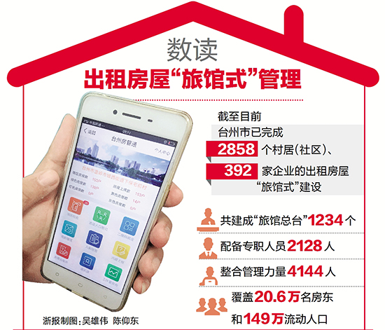 房客租房難、房東出租難、公安部門治安管理難一直是出租房的“老大難”問題。2015年,臺州市率先在全省推出出租房屋“旅館式”管理,參照旅館業(yè)開張審查、入住登記、監(jiān)督檢查、離房注銷管理模式,將分散的一棟棟、一間間出租房,當(dāng)作旅館的客房進行管理。