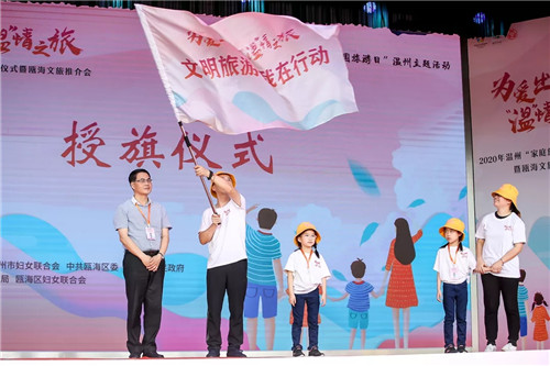 活動(dòng)現(xiàn)場(chǎng),景區(qū)代表宣讀“用心服務(wù)、品質(zhì)保證”承諾宣言書,進(jìn)一步打造文明和諧、舒適安全的旅游服務(wù)環(huán)境。同時(shí),溫州市文化廣電旅游局黨組成員、副調(diào)研員包崇柳在“文明旅游我在行動(dòng)”授旗儀式中為家庭代表授旗。