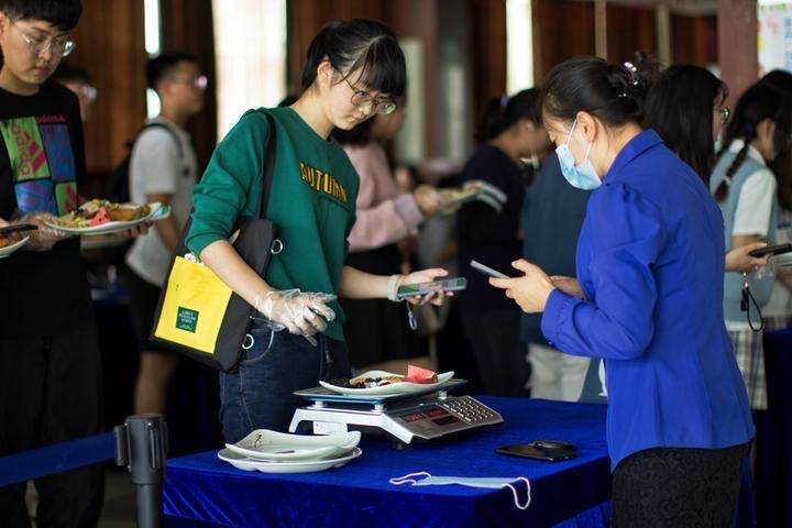 一到午飯時(shí)間,自助餐現(xiàn)場(chǎng)人氣一下子就“旺”了,老師同學(xué)們有序排隊(duì),拿起餐盤,自主挑選所需菜品。酸菜魚、蒜薹炒肉、辣炒花菜、白灼蝦、椒鹽排骨、年糕炒肉、豌豆玉米等琳瑯滿目,應(yīng)季水果、精美甜品應(yīng)有盡有……據(jù)工作人員介紹,食堂每日提供菜品三十余種,圣女果、西瓜、哈密瓜等新鮮水果都會(huì)及時(shí)供應(yīng)。挑選完畢后,老師和同學(xué)們將餐盤放在秤上稱重,按每50克2.5元的價(jià)格結(jié)賬付款?紤]到每位同學(xué)對(duì)于主食的需求量不同,本著不浪費(fèi)的原則,該校食堂也實(shí)施了米飯免費(fèi)不限量自主打取的規(guī)定,精準(zhǔn)解決“一份吃不完”或“不夠吃”的現(xiàn)象。