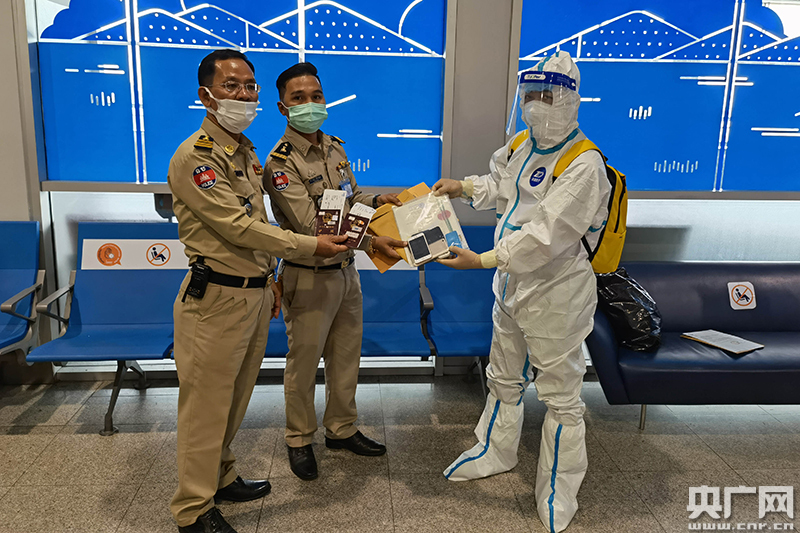 在柬埔寨金邊機場,民警與柬埔寨方面工作人員交接黑惡目標逃犯。(央廣網(wǎng)發(fā) 通訊員陳建波 攝影)