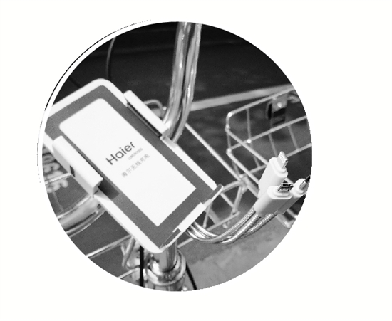與有些單車不一樣的是,“土豪金”單車車前還有一個(gè)充電寶,并搭載了三種不同接口的充電線。這款特別的“充電寶”只能在騎行時(shí),才可以為手機(jī)等移動(dòng)電子設(shè)備充電,并且自帶手機(jī)支架及三款常見(jiàn)的數(shù)據(jù)線。