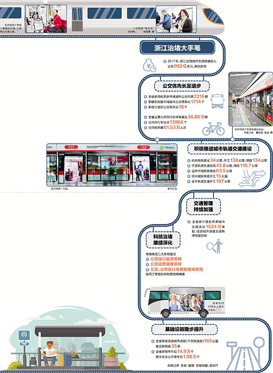 大力治理交通擁堵,加快公交、地鐵設(shè)施建設(shè),是2017年浙江省十大民生實事之一。一年多來,杭州地鐵2號線全線貫通,4號線南段開通,地鐵網(wǎng)骨架基本搭建完成,日均客流量超過120萬人次。在交通運輸部剛剛發(fā)布的報告中,杭州已從上一年的“中國堵城第8位”迅速下滑到第48位。