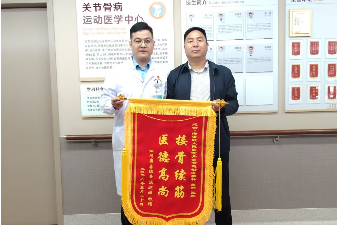 診室里,闊別三年半的兩人緊緊相握,老池難掩激動(dòng):“苗醫(yī)生,沒(méi)有您,就沒(méi)有我的今天!我不僅站起來(lái)了,還跑起來(lái)了,還拿了冠軍!”說(shuō)著,他展開(kāi)鮮紅的錦旗,“接骨續(xù)筋,醫(yī)德高尚”八個(gè)燙金大字格外醒目。苗帥為老池仔細(xì)查體后,欣慰地發(fā)現(xiàn)其膝關(guān)節(jié)功能恢復(fù)極佳,足以支撐高強(qiáng)度的籃球運(yùn)動(dòng),這份千里之外的驚喜,讓他滿是動(dòng)容。