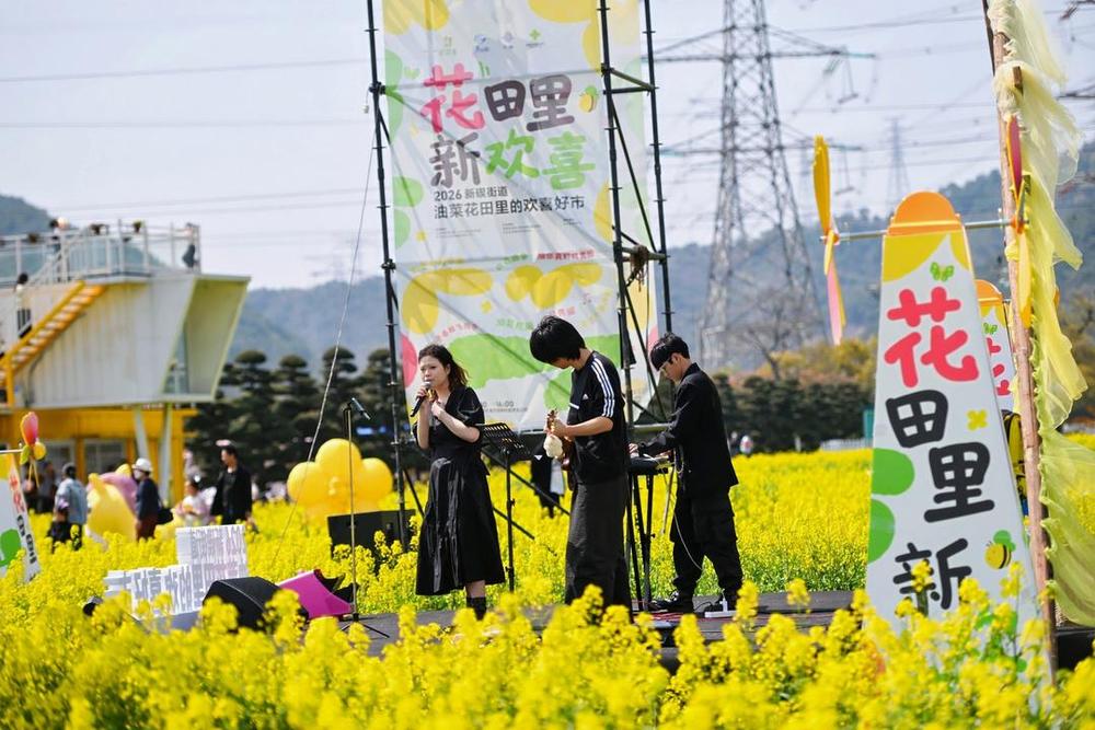 央廣網(wǎng)寧波3月29日消息(記者張雯雯 通訊員嚴武意)3月的寧波北侖新碶,是金黃色的,千畝方田新歡喜農(nóng)業(yè)公園里,油菜花開得正盛。3月28日,這片花海有些不同,田埂間“長”出了一場共富市集、一個花海音樂會、一組萌趣游戲……