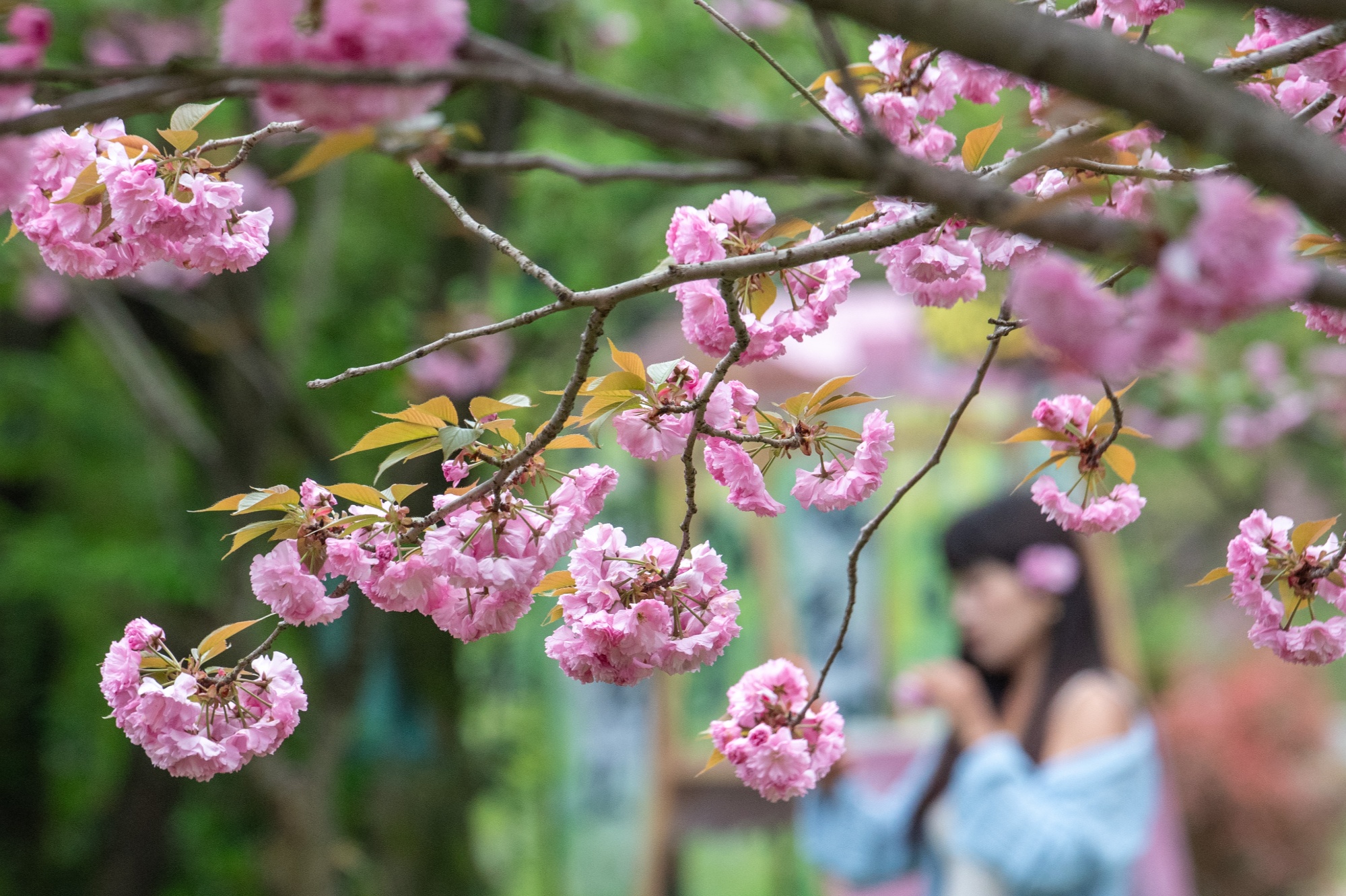 據(jù)介紹,這片近萬畝的櫻花園擁有染井吉野櫻、關山櫻、普賢櫻、楊貴妃等100多個櫻花品種。眼下,晚櫻全面進入盛花期,本周末迎來最美觀賞期。