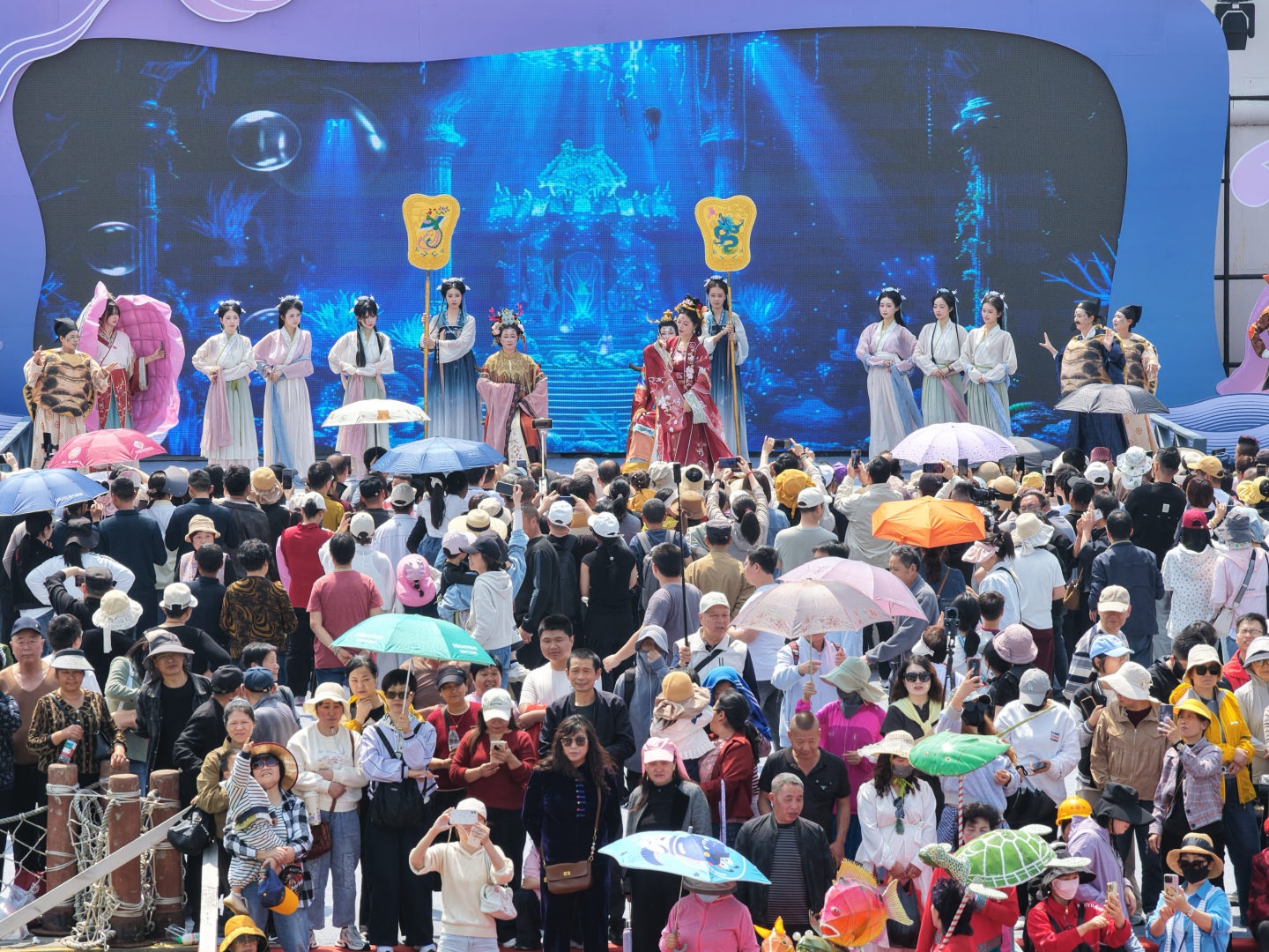 活動(dòng)當(dāng)日,各類民俗活動(dòng)有序開展、亮點(diǎn)紛呈。由石浦當(dāng)?shù)貪O民、村民組成的傳統(tǒng)民俗隊(duì)伍開啟巡游,金龍騰躍、魚燈翩躚,鏗鏘有力的鼓點(diǎn)傳遞著千年漁港耕海牧漁的歲月記憶,質(zhì)樸的漁家風(fēng)貌展現(xiàn)得鮮活生動(dòng)。首次推出的“陸秀夫與辣螺姑娘”愛(ài)情主題方陣吸睛無(wú)數(shù):南宋文臣執(zhí)笏、武將披甲,執(zhí)戈而立,氣宇軒昂,配合悠揚(yáng)漁歌,將那段凄美傳奇鮮活重現(xiàn),讓現(xiàn)場(chǎng)游客直觀感受傳統(tǒng)文化的深厚底蘊(yùn)。漁民大舞臺(tái)上,民俗情景劇《辣螺姑娘招親》精彩呈現(xiàn),通過(guò)拋繡球、對(duì)漁歌等互動(dòng)形式,進(jìn)一步增強(qiáng)了游客的參與感與體驗(yàn)感。