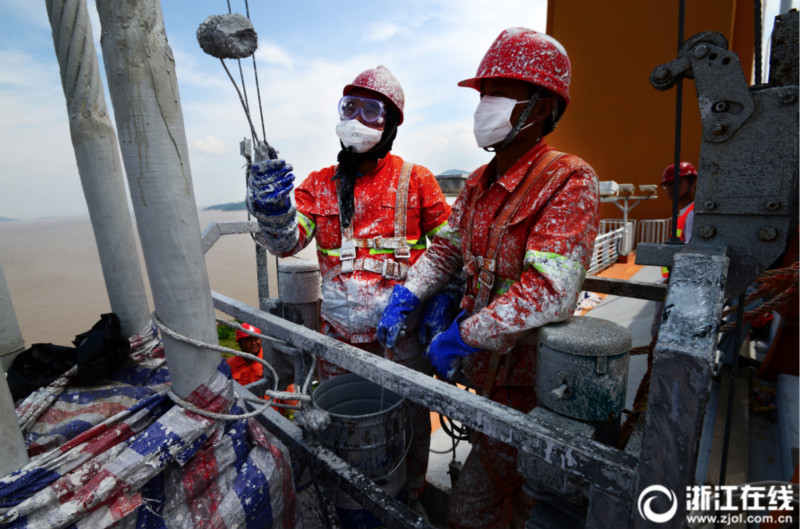 6月18日上午,舟山跨海大橋之一的西堠門(mén)大橋上,猶如蜘蛛俠的建橋工人在半空中進(jìn)行吊索保養(yǎng)涂裝,為吊索穿上防腐衣。(姚峰 舒鷗 攝)