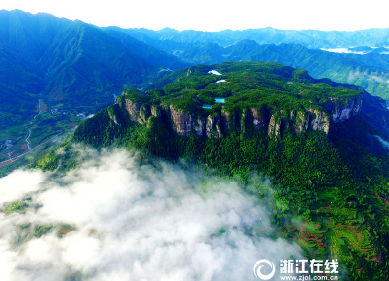 7月4日,鳥瞰景觀獨特云?澙@的仙居方巖風景區(qū)。仙居方巖風景區(qū)是火山流紋巖地貌典型,眾山巍兀獨立,險峻無比,迥然各異。常年云霧繚繞,把整個方巖托在半空,仿佛海市蜃樓般的神秘而悠遠。(王華斌 鄭建昇 攝)