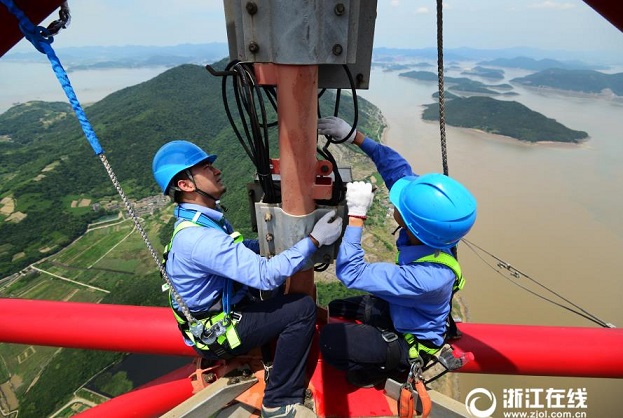 7月19日上午,舟山供電公司輸電運檢室的工人在轄區(qū)大貓山輸電高塔進行塔上設備檢查,以確保線路安全運行。大貓山輸電鐵塔高370米,是目前世界第一高鐵塔,所承載的220千伏線路是舟山的輸電生命線,它的運行安全直接關(guān)系著舟山的經(jīng)濟發(fā)展。(浙江在線拍友 姚峰 張帆 攝)