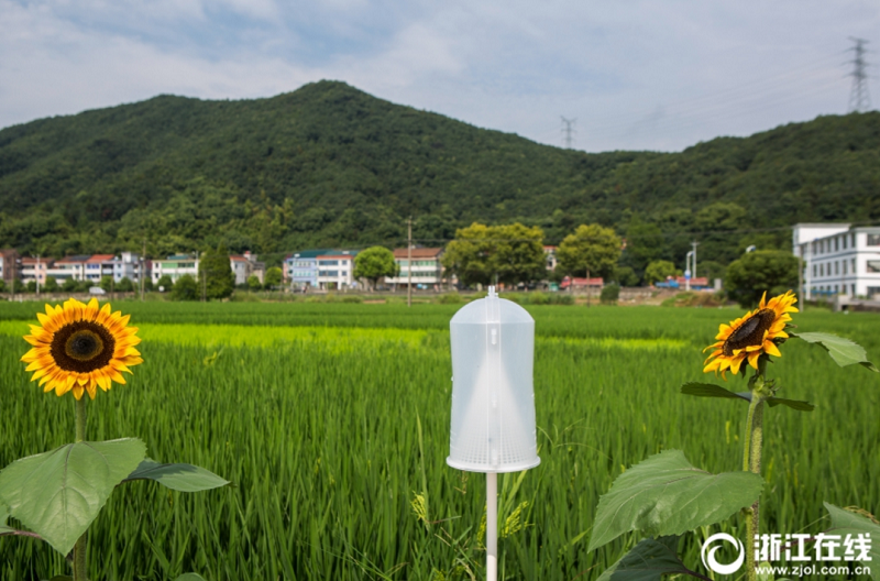 近日,在蕭山區(qū)戴村鎮(zhèn)南三村的水稻病蟲(chóng)害省級(jí)綠色防控示范區(qū)里,出現(xiàn)了一個(gè)個(gè)白色“燈籠”。據(jù)了解,這些白色“燈籠”叫做“新型飛蛾誘捕器”。目前正是水稻二化螟防控的關(guān)鍵時(shí)刻,稻田承包戶通過(guò)它來(lái)誘殺雄性二化螟成蟲(chóng),以達(dá)到不使用農(nóng)藥、糧食增產(chǎn)的目的。(麥粒兒 攝)