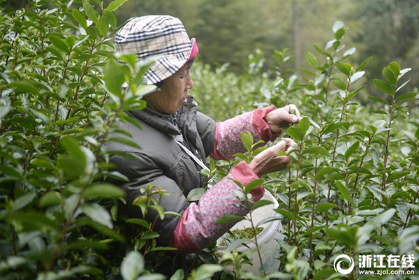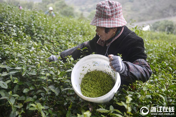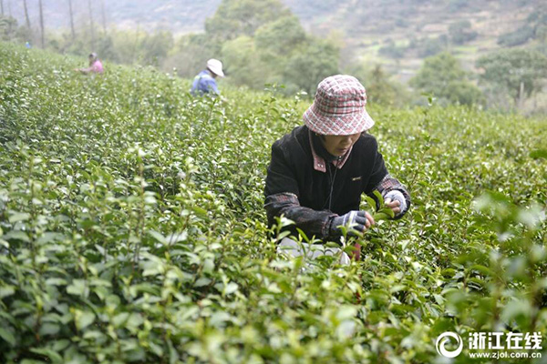 3月7日,茶農(nóng)正在舟山市定海區(qū)泉鎮(zhèn)金山茶園采摘“明前茶”。