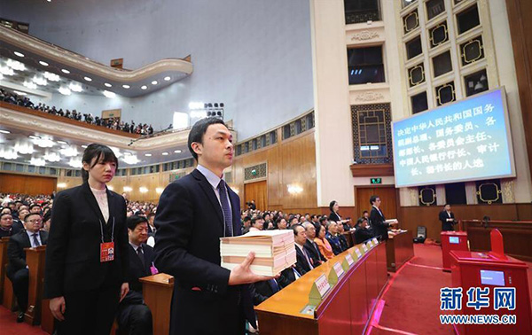 3月19日,十三屆全國人大一次會議在北京人民大會堂舉行第七次全體會議。這是工作人員準(zhǔn)備發(fā)票。新華社記者劉衛(wèi)兵攝