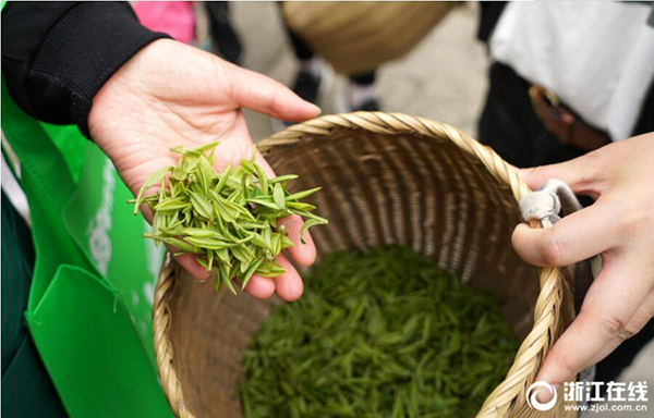 3月7日,茶農(nóng)正在舟山市定海區(qū)泉鎮(zhèn)金山茶園采摘“明前茶”。