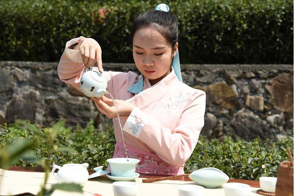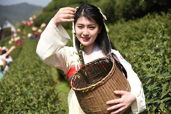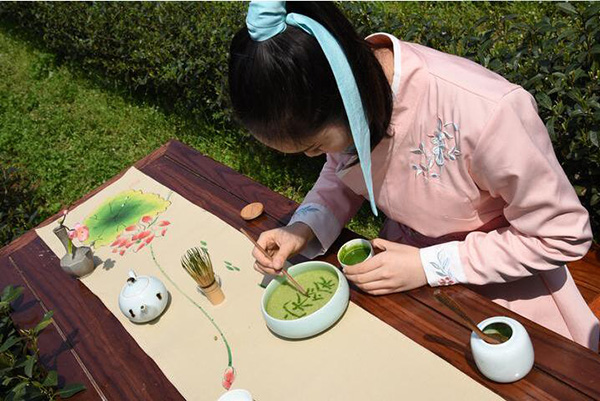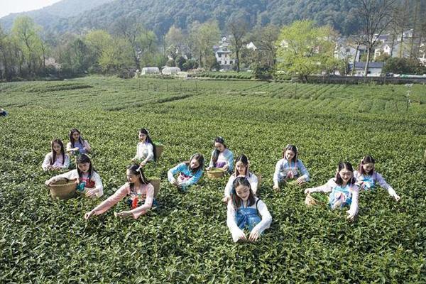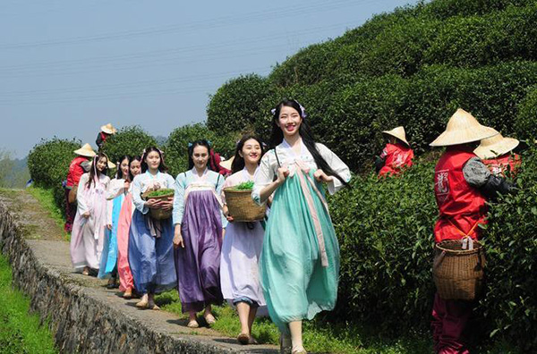 3月27日,宋城千古情藝術(shù)團(tuán)的美女演員穿越成宋代茶娘,在杭州茶園采茶并現(xiàn)場表演大宋點(diǎn)茶技藝,引發(fā)眾多游客圍觀。