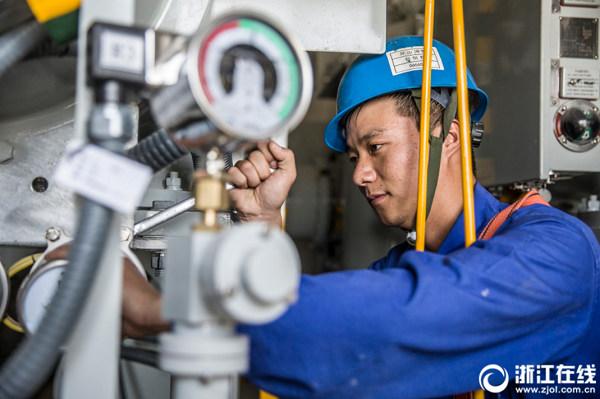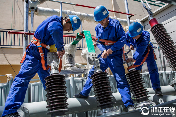 4月9日,岱山縣魚山島220千伏變電站施工現(xiàn)場,電力工人正在進行主變壓器接線及GIS設(shè)備的安裝測試工作。據(jù)了解,魚山島220千伏變電站工程已接近尾聲,預(yù)計5月中旬投運。投運后,將滿足魚山島綠色石化基地用電需求,提高電網(wǎng)的供電可靠性,助推舟山自貿(mào)區(qū)高速發(fā)展。