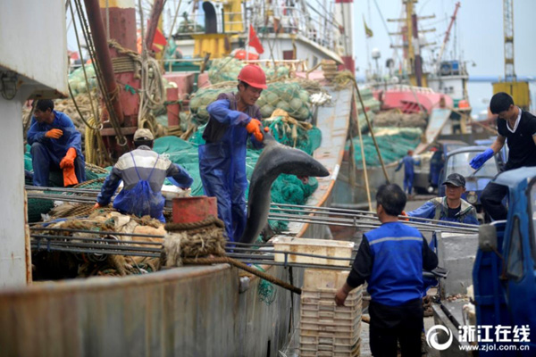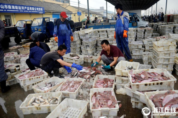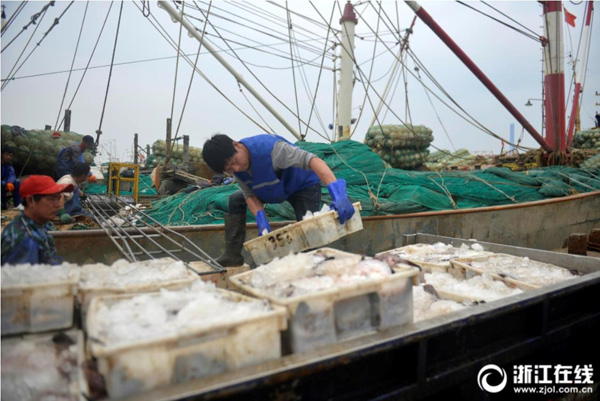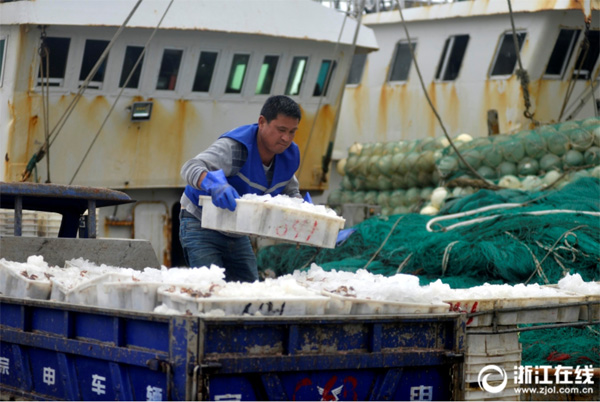 4月23日,舟山漁業(yè)公司水產(chǎn)碼頭一片繁忙景象,來自浙岱漁0235、浙嵊07713等60多艘漁船?吭诖a頭卸載漁貨進(jìn)行交易,運(yùn)往有關(guān)冷庫儲存,等到休漁期間供應(yīng)市場,豐富市民餐桌。