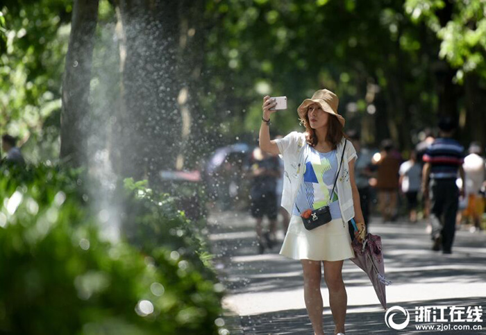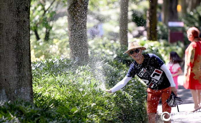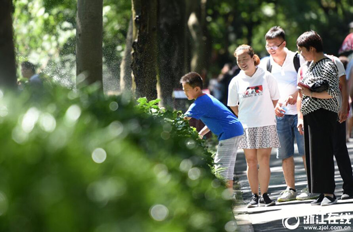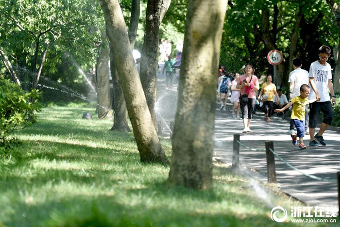 7月18日,杭州入伏后,持續(xù)高溫。在西湖蘇堤,園林工人開啟綠化帶中的噴淋裝置,給驕陽下“喊渴”的植物澆水,也給熱浪中的游客帶來絲絲清涼。