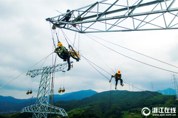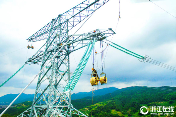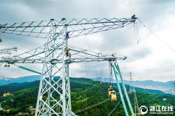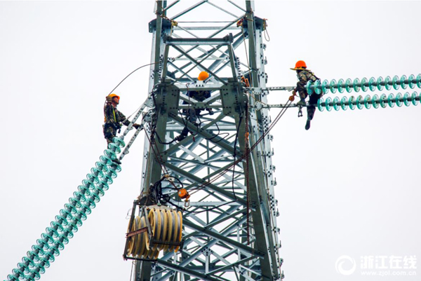 8月2日下午,電力工人在舟山500千伏聯(lián)網(wǎng)工程普通線路段161號(hào)鐵塔上進(jìn)行高空附件安裝作業(yè),趕在今年第12號(hào)臺(tái)風(fēng)“云雀”到來前完成該段線路架設(shè)。據(jù)了解,舟山500千伏聯(lián)網(wǎng)工程舟山本島段共設(shè)鐵塔49基,線路總長(zhǎng)22.165公里。目前已完成鐵塔架設(shè)36基,架設(shè)線路12.8公里,計(jì)劃于年內(nèi)完成全部線路施工。 (浙江在線拍友 姚峰 張帆 王浩 攝)
