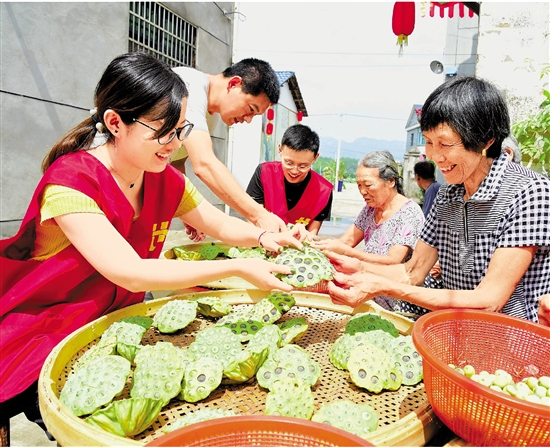 8月13日,建德市航頭鎮(zhèn)年輕黨員干部幫助玨塘村種植戶一起采蓮蓬、剝蓮子,到基層一線蹲點成長。