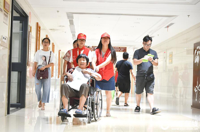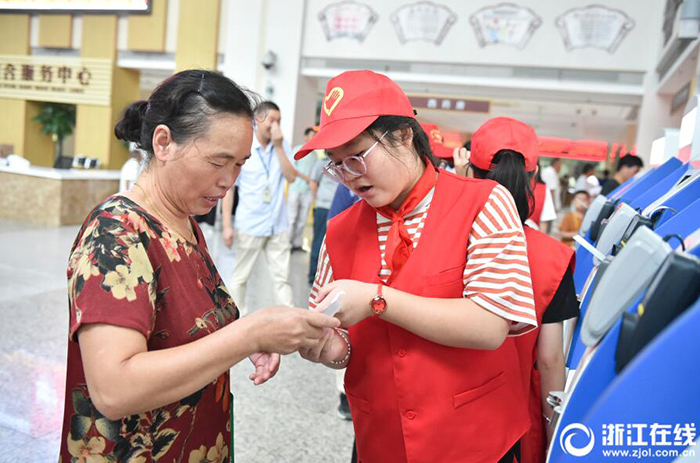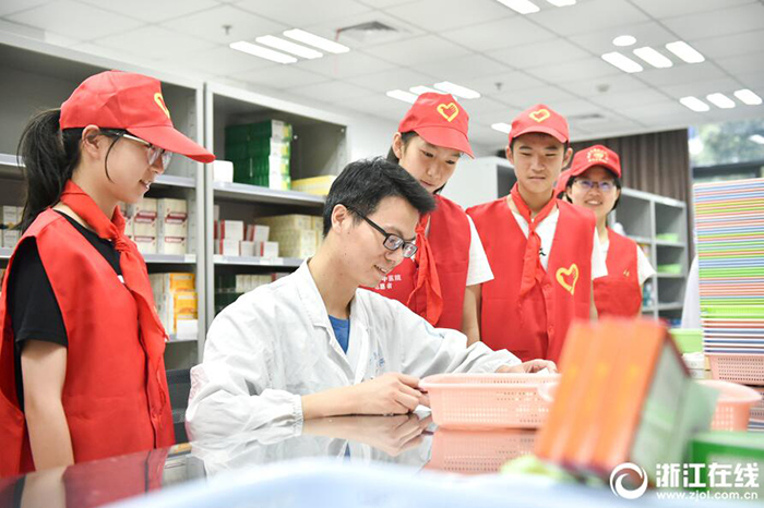 8月22日,浙江桐廬中醫(yī)院內(nèi),來自桐廬縣實(shí)驗(yàn)初級(jí)中學(xué)的學(xué)生在做導(dǎo)醫(yī)服務(wù)。