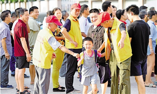 9月4日傍晚,桐廬縣鳳川小學(xué)校門(mén)口,由退休黨員組成的“校門(mén)爺爺”護(hù)童隊(duì)在義務(wù)護(hù)送小學(xué)生放學(xué)。據(jù)了解,鳳川小學(xué)校門(mén)口是一條縣級(jí)公路,路況復(fù)雜。一些退休黨員自愿成立“校門(mén)爺爺”護(hù)童隊(duì),5年來(lái)風(fēng)雨無(wú)阻守護(hù)孩子們的安全。(記者 吳元峰 攝)
