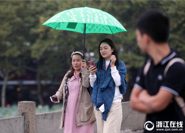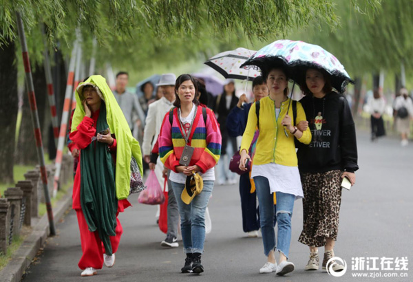 一場(chǎng)秋雨一場(chǎng)涼,10月10日,隨著一場(chǎng)雨水沖刷,杭州城區(qū)最低溫度跌至17℃,西湖景區(qū)的游人紛紛穿上厚厚外衣。11日杭州還有弱冷空氣補(bǔ)充,最低溫度將達(dá)12-14℃。(浙江在線(xiàn)記者 林云龍 尹海木 阮西內(nèi) 攝)