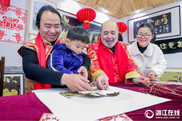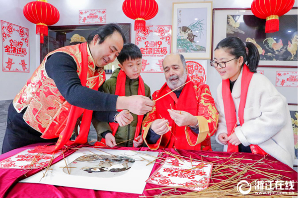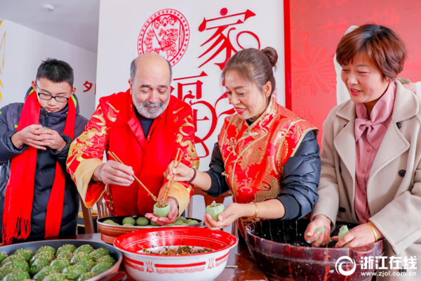 1月30日,湖州市南潯區(qū)舊館鎮(zhèn)開展“濃濃中國年”新時代文明實踐主題活動,應(yīng)邀參加的外國友人穿上唐裝,與村民們一起學(xué)習(xí)麥稈畫、制作青團,體驗中國的“非遺”和傳統(tǒng)民俗,感受濃濃的中國年味。(浙江在線拍友 陸一平 攝)
