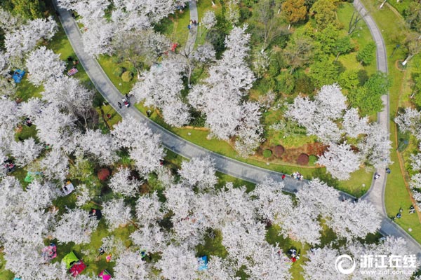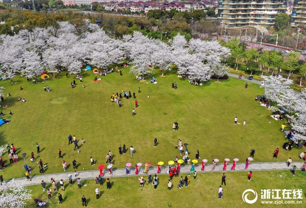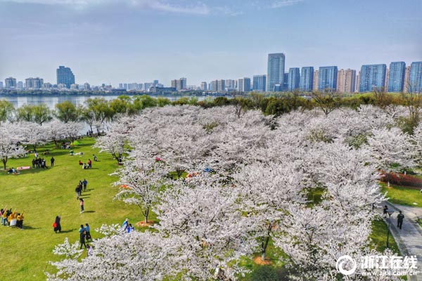 3月26日,紹興瓜渚湖東岸公園里櫻花怒放,在湖畔形成粉色花海,驚艷了一批又一批慕名而來的游客。(浙江在線記者 董旭明 鄭培庚 攝)