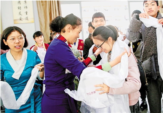 11月24日上午,由湖州市人大機(jī)關(guān)、各縣區(qū)人大組織的10個人大“代表媽媽”愛心團(tuán)隊,與菱湖中學(xué)的9個西藏班和50位散插班藏族學(xué)生開展結(jié)對。下一步,“代表媽媽”們將共同參與組織參觀學(xué)習(xí)、聯(lián)系對接具體幫扶、特殊需求學(xué)生“一對一”結(jié)對等活動,幫助西藏學(xué)生更好地學(xué)習(xí)、生活和成長。圖為西藏班學(xué)生為“代表媽媽”獻(xiàn)哈達(dá)。