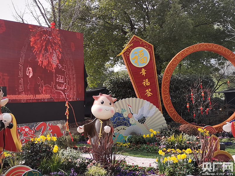 幸福簽、梅花窗、紅燈籠、喜慶橋、可愛的牛年吉祥物……在杭州市下城區(qū)西湖文化廣場和耀江發(fā)展中心大廈,兩處新增添的環(huán)境小品一下子讓人“聞”到了過年的味道。