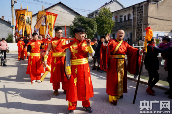 央廣網(wǎng)衢州2月6日消息(記者傅煒如) "福也,好!福也,好!"穿著大紅戲服的曾令兵一聲吆喝,村民在旁高聲呼應(yīng),隨即鑼鼓打響,常山喝彩歌謠《上梁》在衢州常山古縣村熱熱鬧鬧地上演了。