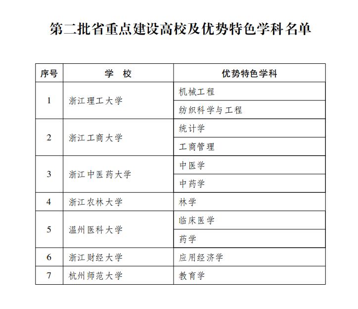 8月29日,記者從省政府官網(wǎng)獲悉,省政府決定啟動(dòng)第二批省重點(diǎn)高校建設(shè),同意省教育廳推選的浙江理工大學(xué)、浙江工商大學(xué)、浙江中醫(yī)藥大學(xué)、浙江農(nóng)林大學(xué)、溫州醫(yī)科大學(xué)、浙江財(cái)經(jīng)大學(xué)、杭州師范大學(xué)為第二批省重點(diǎn)建設(shè)高校。第二批省重點(diǎn)建設(shè)高校以?xún)?yōu)勢(shì)特色學(xué)科為遴選依據(jù)和建設(shè)基礎(chǔ),共涉及11個(gè)學(xué)科。
