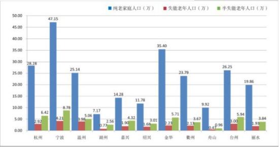 全省純老家庭人口數(shù)為249.00萬人,占老年人口總數(shù)的23.06%。純老家庭人口數(shù)列前3位的依次為寧波市、金華市和杭州市,分別為47.15萬人、35.40萬人和28.28萬人;全省失能、半失能老年人口共75.50萬人,占老年人口總數(shù)的6.99%,其中:失能和半失能老年人口分別為25.23萬人、50.27萬人。失能、半失能老年人口數(shù)列前3位的依次為寧波市、杭州市和溫州市,分別為12.99萬人、9.33萬人和9.03萬人。