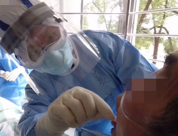 夏美丹為病人采集咽拭子(浙江第五批援助湖北醫(yī)療隊供圖)