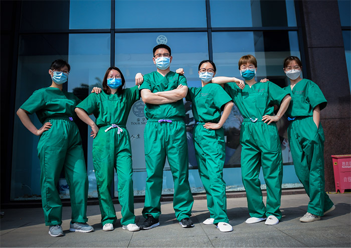 何娟和同事穿上手術服一起拍照留念(浙江第五批援助湖北醫(yī)療隊供圖)